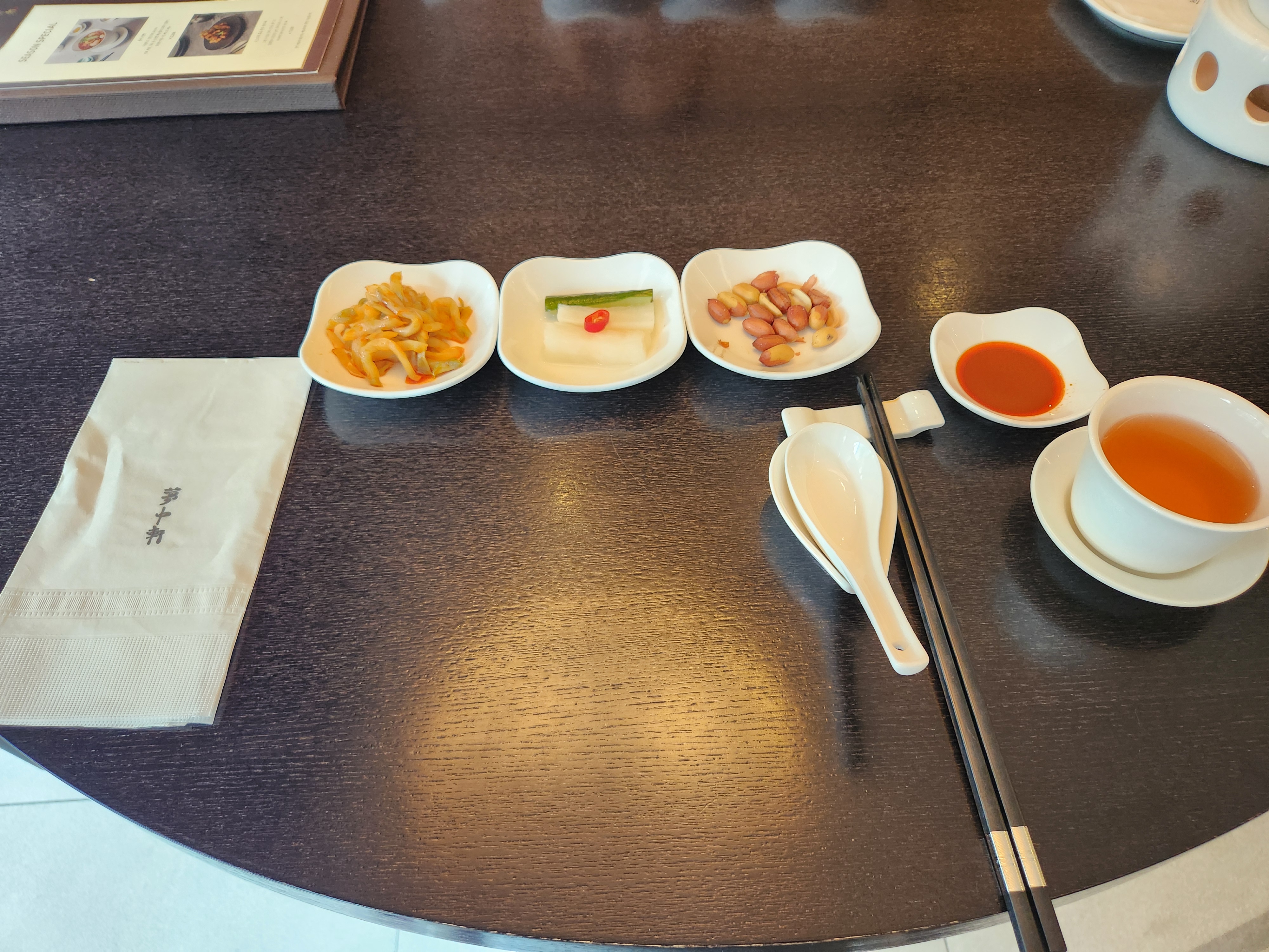 자리의 기본세팅, 중식당 답게 짜사이와 땅콩 등이 세팅되어 있습니다.